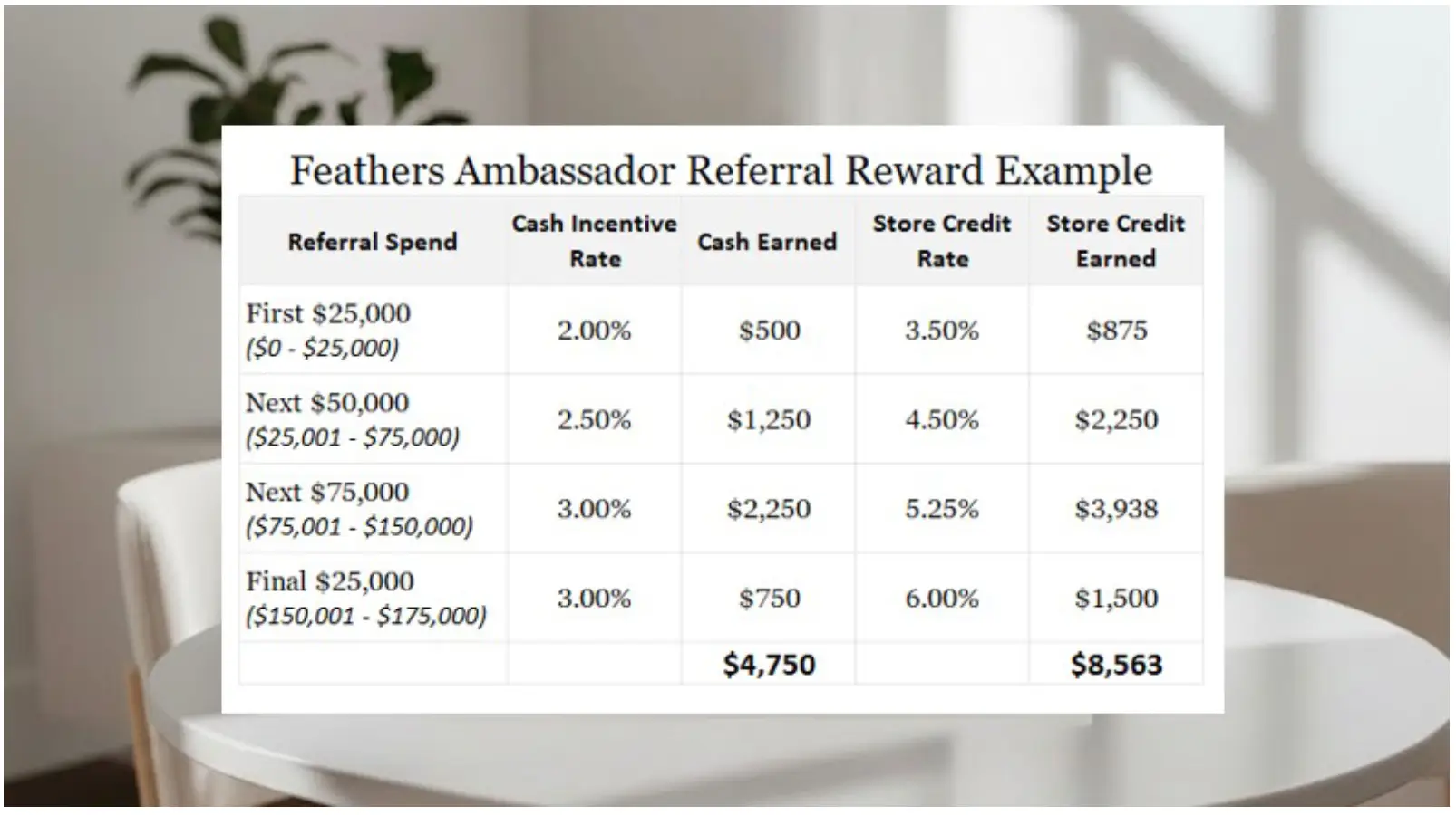 If three of your referrals spend a combined $175,000 in our showroom and you’ve selected Store Credit, you would earn $8,563 in Feathers Store Credit. If you chose Cash Back, your payout would be $4,750.